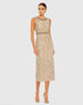 Chic sequined midi sheath dress featuring a dramatic jewel-embellished collar and a jewel-embellished belted waist. Midi-length skirt features a back vent slit.