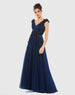 Floral applique A-line gown accented with 3D flowers and heat-set crystals at the shoulders and natural waist.