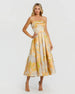 Beige and Orange Strapless Brocade Midi Dress with Pockets