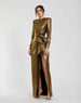 This Metallic Long Sleeve Gown is crafted from shimmering charmeuse fabric, making it perfect for a glamorous event. The long sleeves provide coverage while the thigh high slit adds a touch of sensuality. Finished with a bow detail, this gown exudes elegance and sophistication.