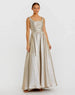 Shine at any formal event in this elegant metallic ballgown. Featuring a square neckline, sleeveless design, and pleated metallic fabric for a stunning shimmer. The intricately pleated bodice adds texture and dimension, making this gown the perfect choice for a memorable, sophisticated look.