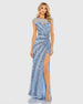 This stunning hand-embellished gown features a high neckline with beaded detailing, short cap sleeves, and allover sequin detailing.