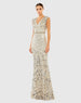 The Embellished V-Neck Cap Sleeve Sequin Gown features an all-over sequin design, a flattering V-neckline, short cap sleeves, and a detailed waist for a stunning silhouette. Beaded accents on the shoulders and skirt add an extra touch of sophistication, making this gown perfect for any special occasion.