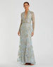 Long sleeve v-neck lace gown with decorative metallic-goldbeading applique and embroidered detail throughout. Natural waist is accent by a hand-beaded belt.