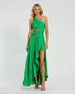 Make a statement in this stunning one shoulder gown. The pleated charmeuse fabric drapes beautifully, while the strappy back and bodice cut-outs add a touch of intrigue. The asymmetrical ruffle hem creates a dramatic silhouette, making this gown perfect for any special occasion.