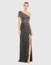 This Pearl Embellished Soft Tie One Shoulder Gown combines sophistication and glamour with its hand-embellished mesh overlay, asymmetrical one-shoulder neckline, and delicate tie detail. Adorned with pearls and sequins, it features a flattering sleeveless design and a daring thigh-high slit for added drama, making it perfect for a memorable evening.