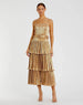 Elevate your look with our Tiered Ruffle Dress, designed for sophistication and style. Featuring a flattering square neckline, luxurious metallic plissé fabric, a chic gold belt buckle detail, and a pleated ruffle skirt, this dress is the perfect choice for weddings, galas, and other special occasions.