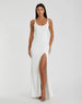 This elegant column gown is crafted from luxurious crepe fabric and features a stunning scoop neckline and a thigh-high slit for a touch of allure. Adorned with a crystal-embellished neckline and straps, this gown exudes sophistication.