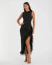 Exude elegance in our Crepe Fabric Sleeveless Dress, featuring a chic high neckline and an asymmetrical hem for a modern twist. The striking feather-detailed side slit adds a touch of glamour and sophistication, making this dress perfect for any special occasion.