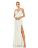 Crafted from crepe fabric, this sleek evening gown features a sweetheart neckline, spaghetti straps, and a thigh-high slit.